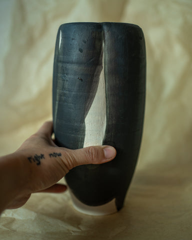 Wheel-thrown vase with altered shape. Black brush mark on white slip surface, highlights the curves.