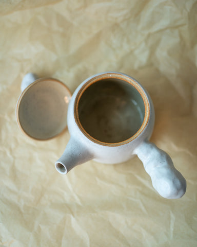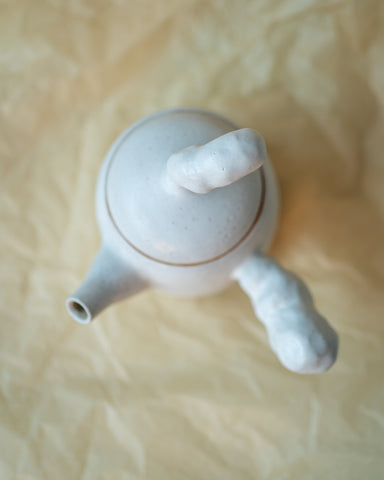 Wheel-thrown teapot body with hand-shaped hollow cloud-shaped handle and knob