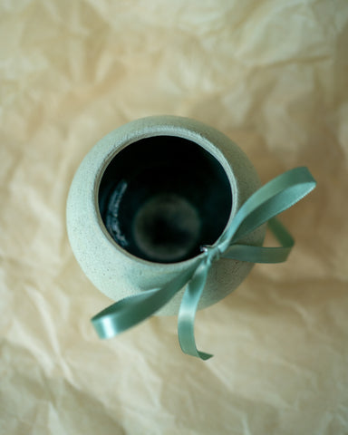 Wheel-thrown Moon Jar with textured colour slip. Glossy black interior.